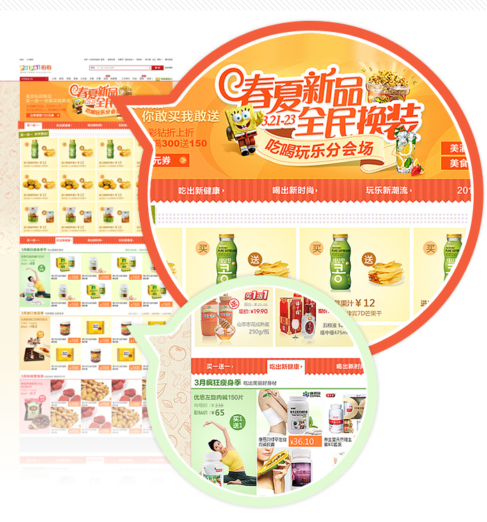 3月促食品分會(huì)場(chǎng)運(yùn)用鮮明的色彩,大背景采用不同食品線稿大小不一、層次分明的組合,渲染出美食熱鬧的氛圍,從而提高消費(fèi)者的購(gòu)買(mǎi)欲望