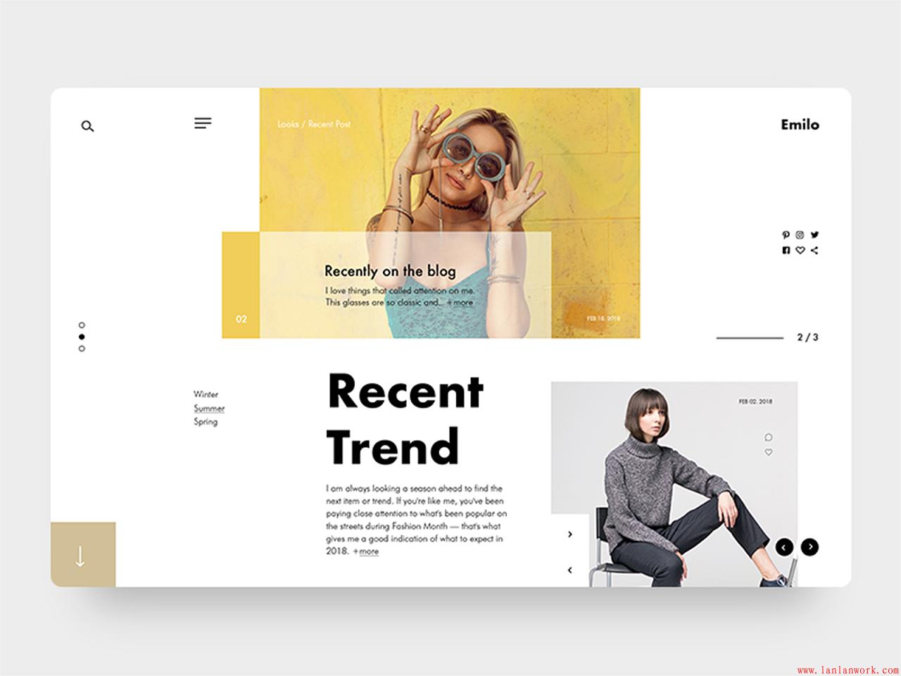 這是一個(gè)記錄美好生活的剪影專題,banner用亮麗黃,將生活的熱情和活力彰顯出來。標(biāo)題字含有黃色,更加醒目招人。選中模塊文字和按鈕使用黃色,呼應(yīng)主題色,使周遭頁面也鮮活起來。