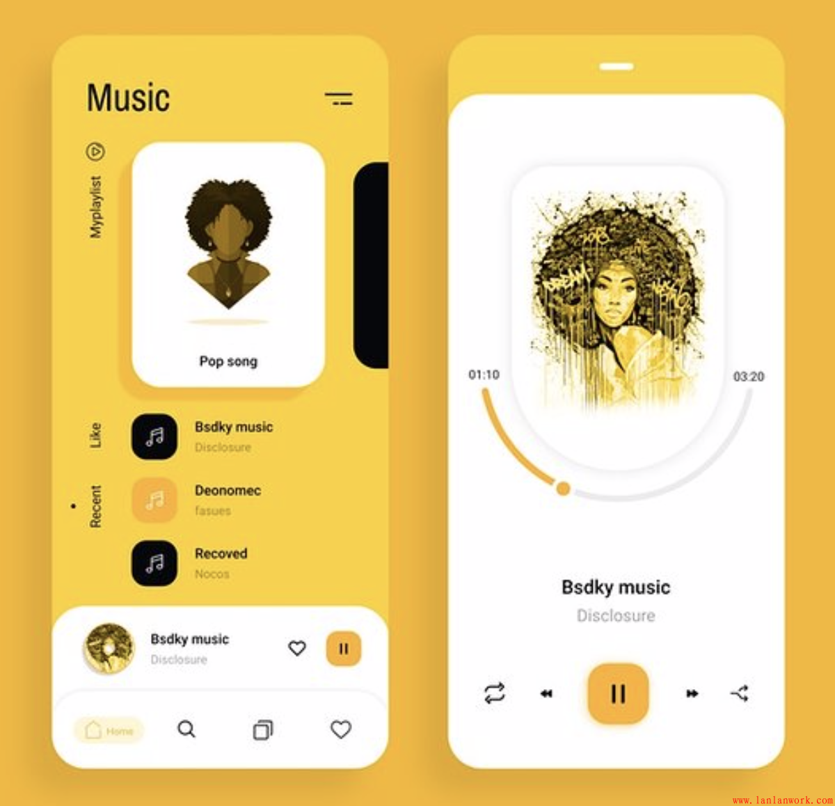這是一個(gè)音樂APP,同前一個(gè)界面一樣,主頁的背景整屏是亮麗黃,卡片帶不同飽和度和明度的投影。按鈕和鼠標(biāo)懸停狀態(tài)為黃色,有突出強(qiáng)調(diào)的作用。時(shí)間軸黃色和灰色相間。整體明朗的同時(shí),增添柔和的色彩,讓人在這個(gè)音樂APP上流連忘返。