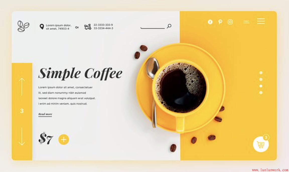 美食一般熱衷于黃色系,不僅給美食增色,也會(huì)讓人食欲大增。這個(gè)咖啡網(wǎng)站,深棕色的咖啡和咖啡豆配上亮黃色的杯子和背景,讓這杯濃濃的咖啡更加誘人。另一半背景則用淡淡的灰色作為陪襯,讓人的眼睛得到休息。