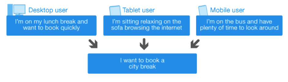 過去,我們通常會(huì)假設(shè)用戶在使用移動(dòng)設(shè)備訪問網(wǎng)站時(shí),其行為都是高度目標(biāo)驅(qū)動(dòng)化的,例如在旅途中獲取酒店地址、預(yù)訂房間一類。但實(shí)際情況不僅如此——智能手機(jī)、平板電腦等各類移動(dòng)設(shè)備的用戶,會(huì)越來越多的在相對(duì)穩(wěn)定從容的狀態(tài)下使用網(wǎng)絡(luò)。所以在很多時(shí)候,用戶使用不同設(shè)備的目標(biāo)差別并沒有想象的那么大,我們不能片面的假設(shè)不同類型設(shè)備的用戶對(duì)功能的需求差異。