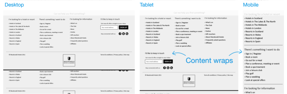 接下來我們需要考慮的是,每一列中的模塊組件應(yīng)該以怎樣的方式隨著頁面的寬度縮放而響應(yīng)式的適應(yīng)和調(diào)整。在這個(gè)過程里,保持團(tuán)隊(duì)成員之間的溝通是非常重要的,包括視覺設(shè)計(jì)師、前端開發(fā)人員等;使用初步的線框原型,與大家交流模塊組件在布局和樣式方面的調(diào)整計(jì)劃,盡量在初期就讓相關(guān)成員對(duì)整個(gè)規(guī)劃做到心中有數(shù),并盡早發(fā)現(xiàn)前端實(shí)現(xiàn)等方面的潛在的問題。