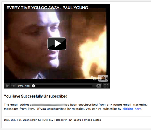 Etsy 會在用戶退訂之后播放Paul Young的"Every Time You Go Away"。這種方式無法讓用戶留下來,但可以給他們留下深刻的印象。當用戶再一次在Etsy平臺上瀏覽商品時,多半會想起這個有意思的小環(huán)節(jié),或許他們無論在哪里聽到這首歌的時候還會想到Etsy呢。