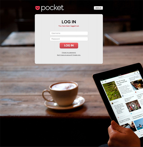 在很多時候你未必需要做的如此特別。以Pocket 為例,他們的登錄頁面具有很強的“歡迎”色彩,一幅巨大的背景圖片烘托出了該應(yīng)用的使用場景,讓用戶覺得身臨其境,在情緒上產(chǎn)生共鳴。