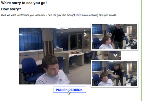 這方面最經(jīng)典的案例莫過于Groupon的著名段子,"懲罰Derrick"。雖然這個過場發(fā)生在用戶確認退訂之后,但它通過真實的人物以及鋒利而又自嘲的幽默,切實拉近了用戶與網(wǎng)站之間的距離。在這個多多少少會使退訂用戶產(chǎn)生內(nèi)疚的段子之后,Groupon還會再慫恿用戶重新進行訂閱。雖然你清楚的知道這是他們玩的小伎倆,但在如此具有代入感的段子面前,多數(shù)用戶會覺得非常有趣,正面情緒和狀態(tài)完全被調(diào)動起來。