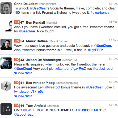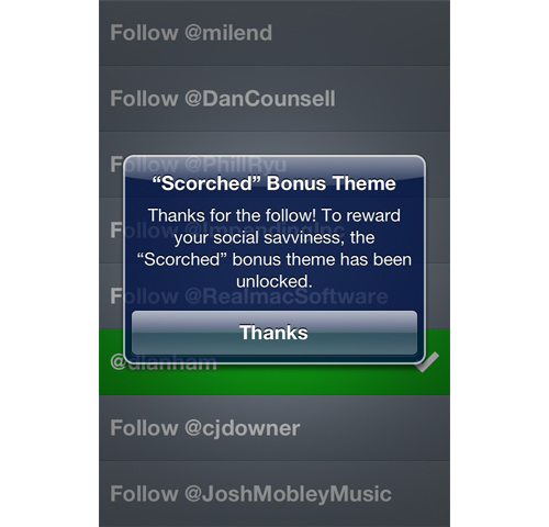 另外,如果你follow了Clear開發(fā)者的Twitter帳號,那么還能獲取另外一款獎勵主題。這個彩蛋的作用依然在于傳播。人們會分享他們的熱忱,甚至談?wù)撍麄儷@得或是錯過了哪些主題。