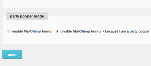 再次以MailChimp為例,他們提供了一種“party掃興模式”,那些對幽默風格不感冒的用戶可以在這里禁用那些有意思的設(shè)計元素。