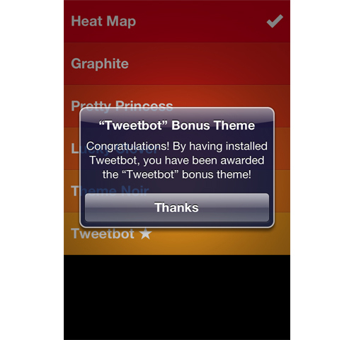驚喜、專享 :在應(yīng)用中打開主題設(shè)置界面后,安裝了Tweetbod的用戶會收到一條消息,恭喜他們獲得了專享的額外主題。這些用戶很可能因為受到了特殊照顧而感到開心,另外,這個群體在口碑傳播方面的作用是相當大的。