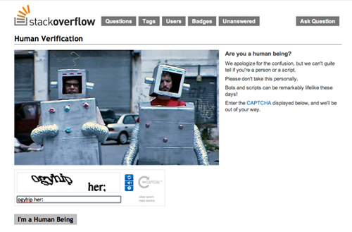 驗證工具Captcha在如今被很多網(wǎng)站所使用,但這不意味著用戶真的喜歡這東西,很多時候Captcha確實會令人感到煩惱和挫敗。我們暫時無法改變這個工具本身的工作機制,但至少可以像Stack Overflow那樣通過一幅有趣的圖片搭配說明文案,向用戶解釋為什么要使用這個煩人的工具,籍此獲得用戶的理解,減少負面情緒的產(chǎn)生。