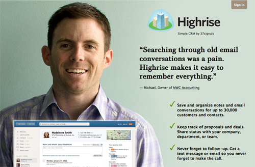 通過這張圖片,Highrise 向我們展示了一個快樂的人,還有他使用該公司產(chǎn)品的故事。來自實際客戶的微笑以及贊許之辭,這是非常正面的、非常容易促使?jié)撛谟脩粽J同并期望獲取其產(chǎn)品的宣傳形式。