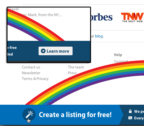 驚喜 :瀏覽到頁腳,你會發(fā)現(xiàn)鼓勵你免費創(chuàng)建活動的圖標與文案,當鼠標懸停在圖標上的時候,一道絢麗的彩虹會突然冒出來,它的動畫效果所指向的正是引導(dǎo)用戶這個操作的按鈕。