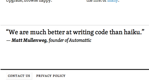 標語 :Automattic的標語之一是“比起俳句,我們更擅長寫代碼”。正是這種看似嚴肅認真的幽默感,或者說看似幽默的認真,奠定了他們的產(chǎn)品基調(diào)。