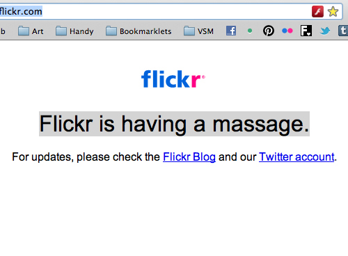 用戶在Flickr進行系統(tǒng)維護或升級期間會看到"Flickr正在做按摩"的提示,如果有興趣的話還可以到他們的官方博客或是微博當中查看當前的具體狀況。這樣的文案比起簡單粗暴的出錯提示來說更能讓用戶接受。