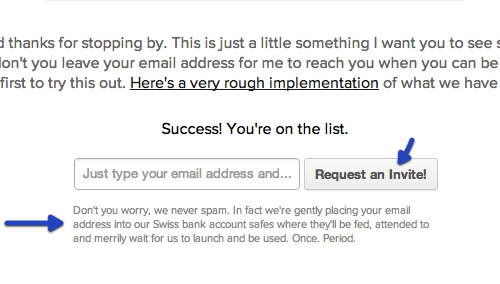 下面的范例來自我的一個個人項目,用戶需要邀請碼才可以試用這個產(chǎn)品。在提交申請的地方,我使用“我要獲取邀請!”來代替?zhèn)鹘y(tǒng)的“提交”作為按鈕當中的文案,希望這可以調(diào)動起用戶的情緒,并使他們感受到一種更加真實、更加有針對性的互動。另外我也起草了一份簡單的說明文案,讓用戶放心,我們絕不會發(fā)送垃圾郵件。