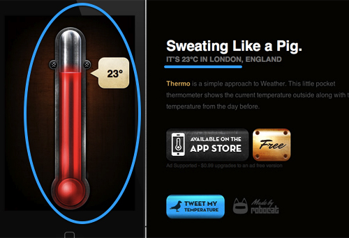 Thermo 應(yīng)用的著陸頁可以判斷用戶所處的地理位置,并在左側(cè)以高度擬真的視覺表現(xiàn)形式來告訴用戶當?shù)氐臍鉁厍闆r。