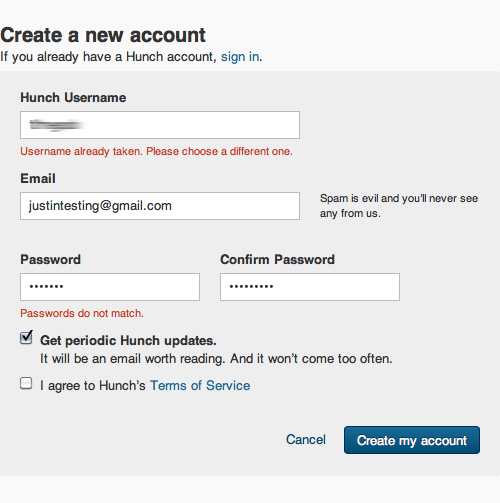 Hunch 注冊頁面當中的文案與我們通常能夠見到的那種有所不同,他們會在輸入郵件的文本框旁邊告訴你“垃圾郵件是魔鬼,我們可不干這事”,還會在選擇郵件訂閱的地方提示你“這會是值得一讀的郵件,而且來的不會太頻繁”。在這些很普通的地方稍稍花些心思,制造一些細微的差異化,這會增強產(chǎn)品的代入感,使用戶的注意力更集中,跟隨設(shè)計的指引完成操作目標。
