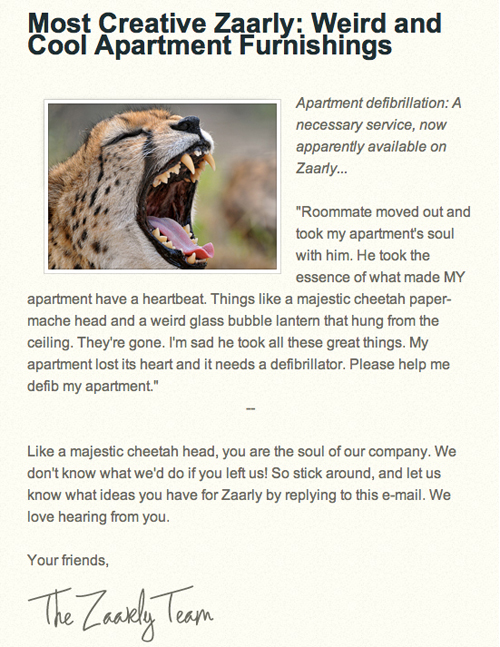 Zaarly在他們的郵件快報中講了一些具有神秘色彩的小故事,這種方式提升了郵件的吸引力,使用戶不由自主的對其中的內(nèi)容以及這個網(wǎng)站提供服務(wù)產(chǎn)生好奇,而不是一味的排斥。