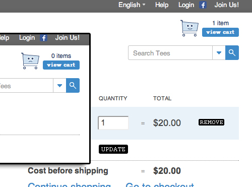 Threadless 的購物車在沒有商品放入時會呈現(xiàn)出憂傷的表情,反之則會表現(xiàn)的非常開心。這樣的小細節(jié)會讓你覺得平凡而有趣,甚至會不由自主的笑起來。即使用戶最終沒有產(chǎn)生購物行為,他們也會記住這個可愛的購物車。