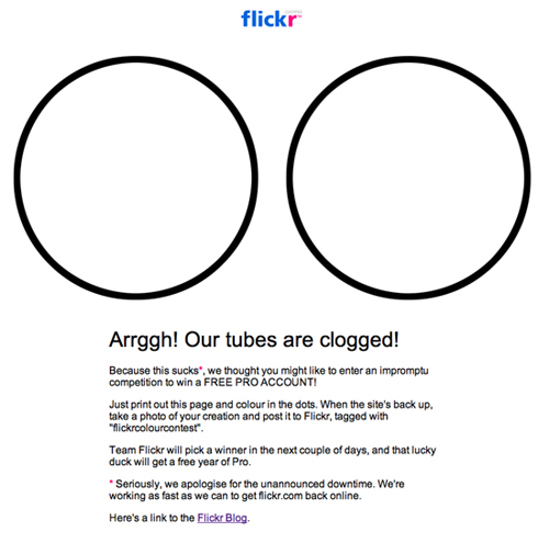 同樣來自于Flickr的案例。當系統(tǒng)發(fā)生了一些更加嚴重的問題時,他們會告訴用戶:“額,我們的管道堵塞了!”,然后使用非??谡Z化的文案表示了歉意。除此之外,他們還為用戶設(shè)置了一個小任務(wù),也就是將當前頁面打印出來,為兩個圓環(huán)填色,然后拍下來,等到站點恢復(fù)正常后傳到Flickr上;Flickr團隊會挑選出優(yōu)勝者,向他們贈送一年的高級帳號。