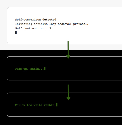 彩蛋 :在WordPress的self-comparison當中有個彩蛋。為了防止相同版本的文章進行自我比較,Automattic創(chuàng)建了一個小機制,無論是其中的文案還是視覺風格都模仿了黑客帝國當中的段子。這篇文章 會教你怎樣在WordPress當中找到這個彩蛋。