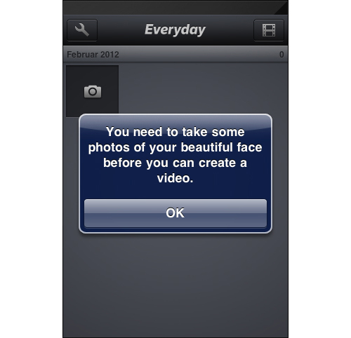 在"Everyday"應(yīng)用當中,如果你還沒有向媒體庫中添加照片,那么系統(tǒng)就會非常友好的提示你去給自己“漂亮的臉蛋”拍些照片放到庫中——簡單的詞匯定義了提示信息甚至是產(chǎn)品的基調(diào),換句話說,就是個性。