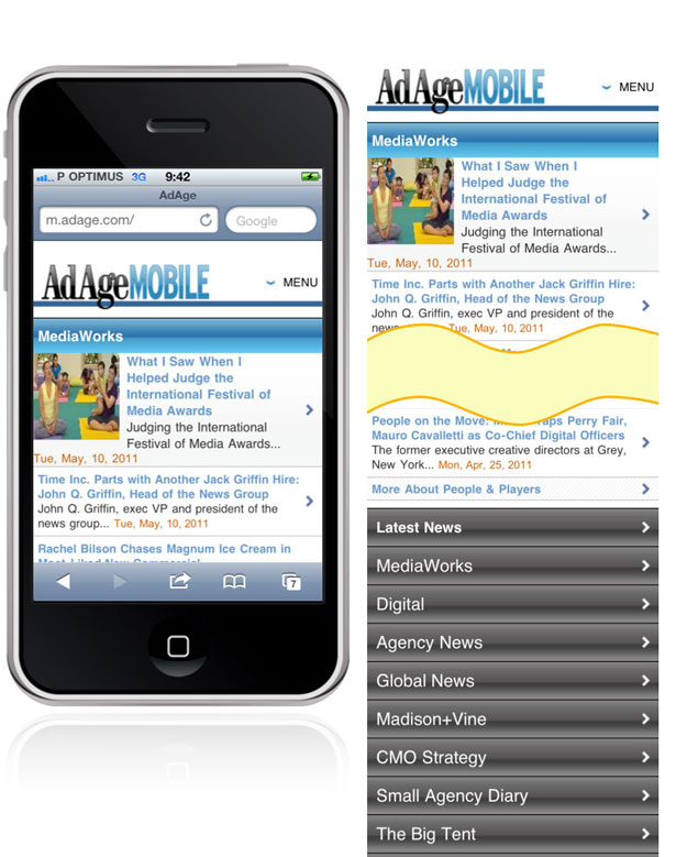 確實是這么回事。移動版本的站點,在布局方面,應(yīng)該使主要內(nèi)容盡量多的占據(jù)著首屏當中的空間,而導航結(jié)構(gòu)則應(yīng)該以某種縮略的形式出現(xiàn)在相對次要的位置。Wroblewski通過一個實例來倡導這個設(shè)計模式,也就是Ad Age的移動版站點 。其首屏當中,除了網(wǎng)站標題及內(nèi)容列表之外,右上角的菜單按鈕是界面當中唯一一個交互控制元素。當用戶點擊這個按鈕時,導航列表才會出現(xiàn)在屏幕當中??瓷先?,整個導航列表好像是另外一個界面,但它實際上是被放置在頁面最下方的,而菜單按鈕只是個錨點而已。