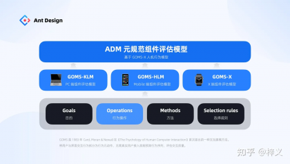 ADM 元規(guī)范的組件評估模式正式基于 GOMS 人機交互模型演變而來。GOMS 是 1983 年 Card 等人在《The Psychology of Huamn Computer Interaction》首次提出的一種交互建模方法,它的核心理念是將用戶與界面交互行為拆解為行為元動作,無需真實用戶介入就能預測交互行為的序列,評估交互的質量。