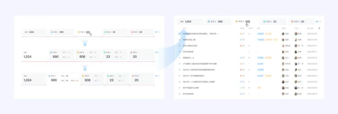 體驗設計師在一些項目中嘗試了將數(shù)據(jù)可視化看板與Tab標簽頁的融合,這就形成了具有Tab切換功能的數(shù)據(jù)看板,用戶在查看概覽數(shù)據(jù)的同時也可以通過點擊切換查看各階段/狀態(tài)下的詳細數(shù)據(jù)。