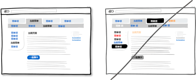 諸如顏色,層次及模塊間的對比這些視覺上的設計可以很好地幫助用戶使用產(chǎn)品:他時刻知道當前所處的頁面以及可以轉(zhuǎn)到哪些頁面。要傳達這樣一個好的界面,你就需要將可點擊的元素(比如連接,按鈕),可選擇的元素(比如單選多選框)以及普通的文字明顯區(qū)分開來。在下圖的例子中,我將點擊操作的元素設置為藍色,選中的當前元素為黑色。這樣適當?shù)脑O計可以讓用戶很方面地在產(chǎn)品的各模塊間切換。但千萬不要把這三種元素設計得混亂不堪。