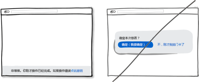 假設你剛點擊了一個連接或者按鈕,撤銷操作可以讓操作流暢自然,這也符合人類的本能。而每次操作都彈一個確定框則好像是在質(zhì)問用戶你明白不明白這個操作會產(chǎn)生什么后果。我還是更習慣假設用戶每次操作都是正確的,其實只有極少數(shù)情況下才會發(fā)生誤操作。所以,為了防止誤操作而設計的確認窗口其實是不人性化的,用戶每次操作都需要進行毫無意義的確定。所以請考慮在你的產(chǎn)品里實現(xiàn)撤銷操作來增加用戶的操作友好度吧。