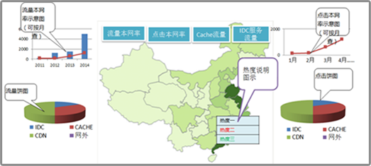 在分省概況模塊里有四個小的模塊。分別是流量本網(wǎng)率、點(diǎn)擊本網(wǎng)率、Cache流量、IDC服務(wù)流量。