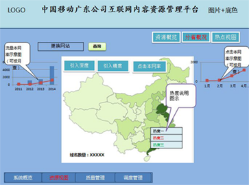 內(nèi)容管理分為兩大模塊,視頻管理和網(wǎng)頁管理。內(nèi)容管理部分,重點(diǎn)呈現(xiàn)全網(wǎng)TOPN熱點(diǎn)資源的各省的IDC引入情況、IDC服務(wù)流量、各省點(diǎn)擊量分布情況。
