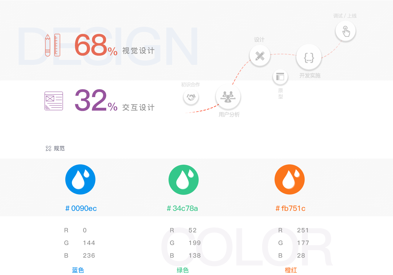 整體顏色以深藍(lán)色為底搭配藍(lán)、綠、橙紅、紅等亮色使用這樣的顏色組合,藍(lán)色為水的顏色同時(shí)為自來(lái)水集團(tuán)Vl標(biāo)準(zhǔn)色配合綠黃使用相互互補(bǔ),同時(shí)藍(lán)綠與橙綠分別是相鄰色而黃色與藍(lán)色又互為互補(bǔ)色,能在設(shè)計(jì)中起到關(guān)鍵信息點(diǎn)、事件強(qiáng)烈對(duì)比作用,以吸引用戶的注意